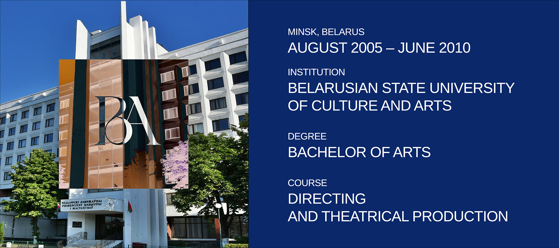 2005 – 2010: BA. Directing and Theatrical Production – Belarusian State University of Culture and Arts, Minsk.
